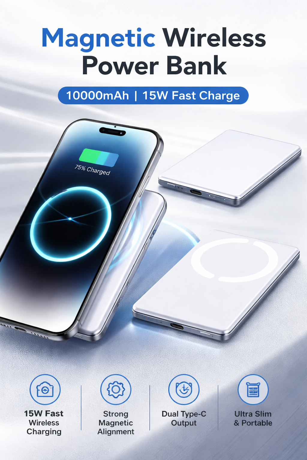 Charge anywhere, anytime with this ultra-slim magnetic wireless power bank. Supports fast charging up to 20W with strong magnetic hold and portable design—perfect for travel and daily use.